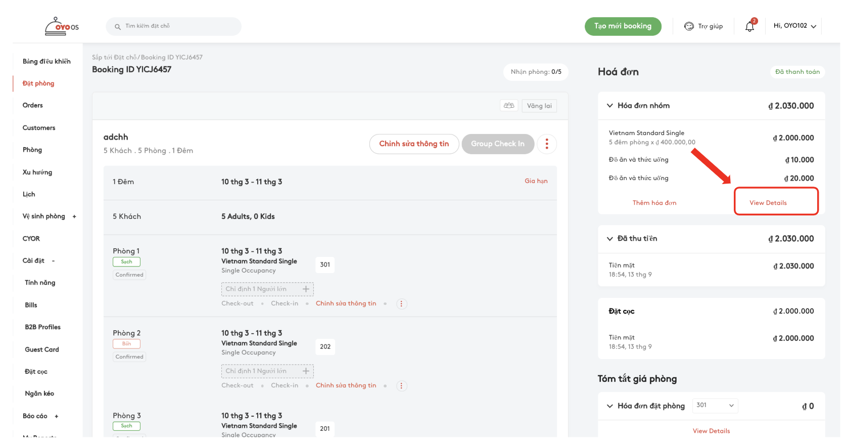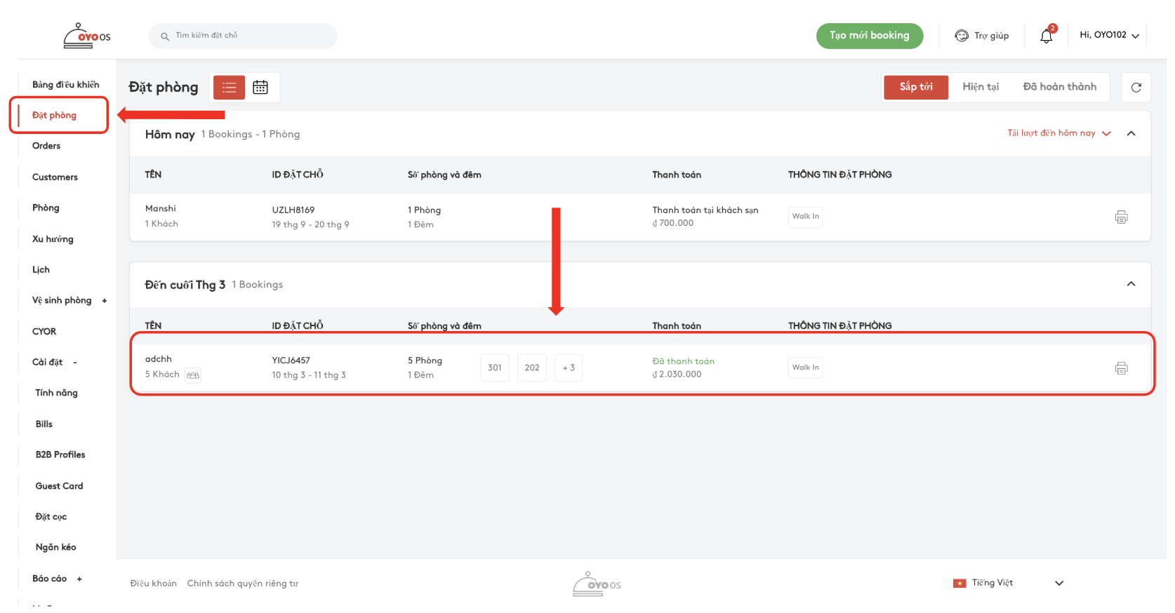 Bước 1:Từ thẻ Đặt phòng, nhấp chọn đặt phòng cần xóa hóa đơn
