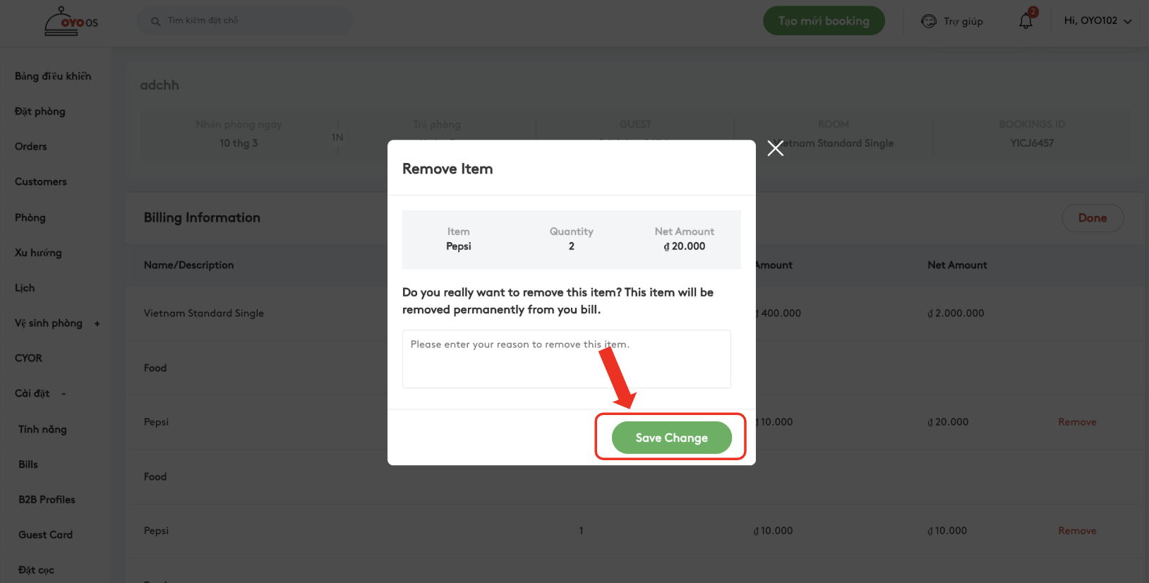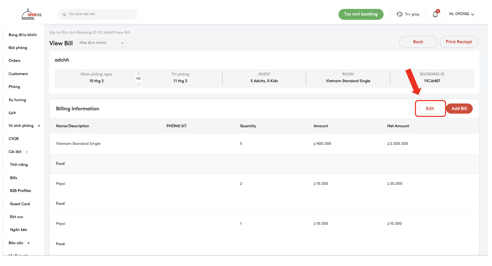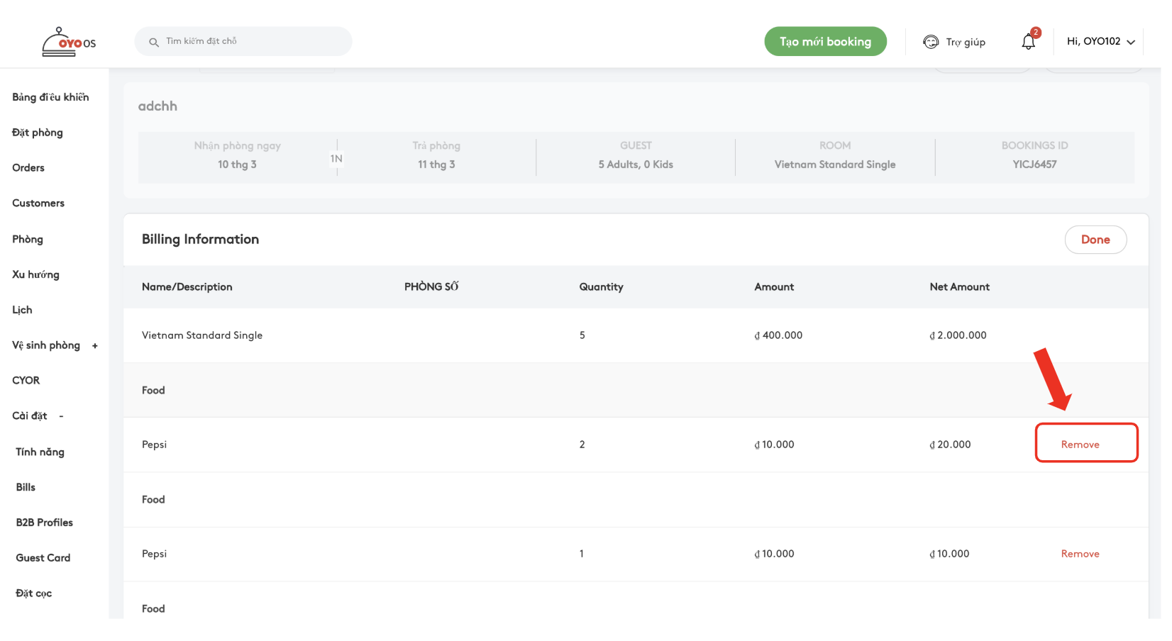 Quản lý khách sạn có thể bỏ các hóa đơn đã thêm qua các bước sau: